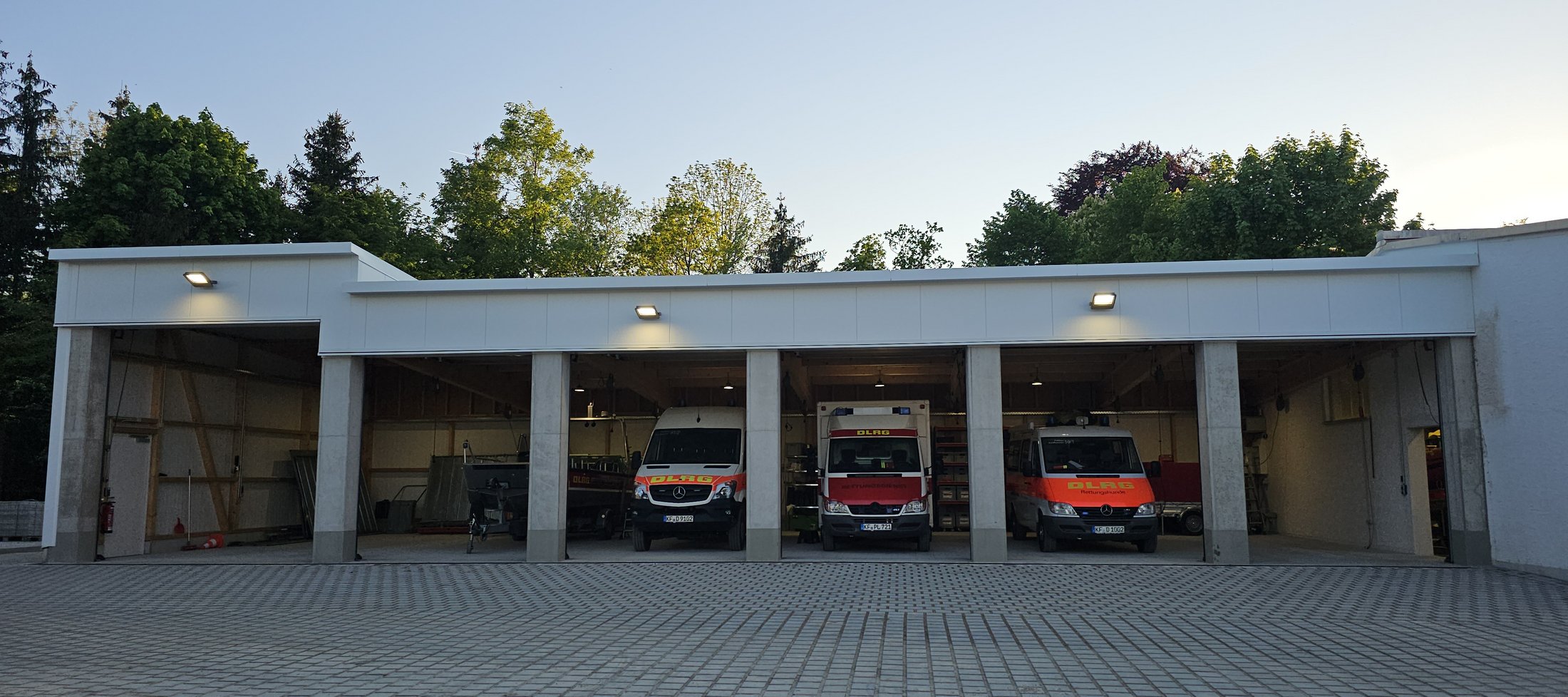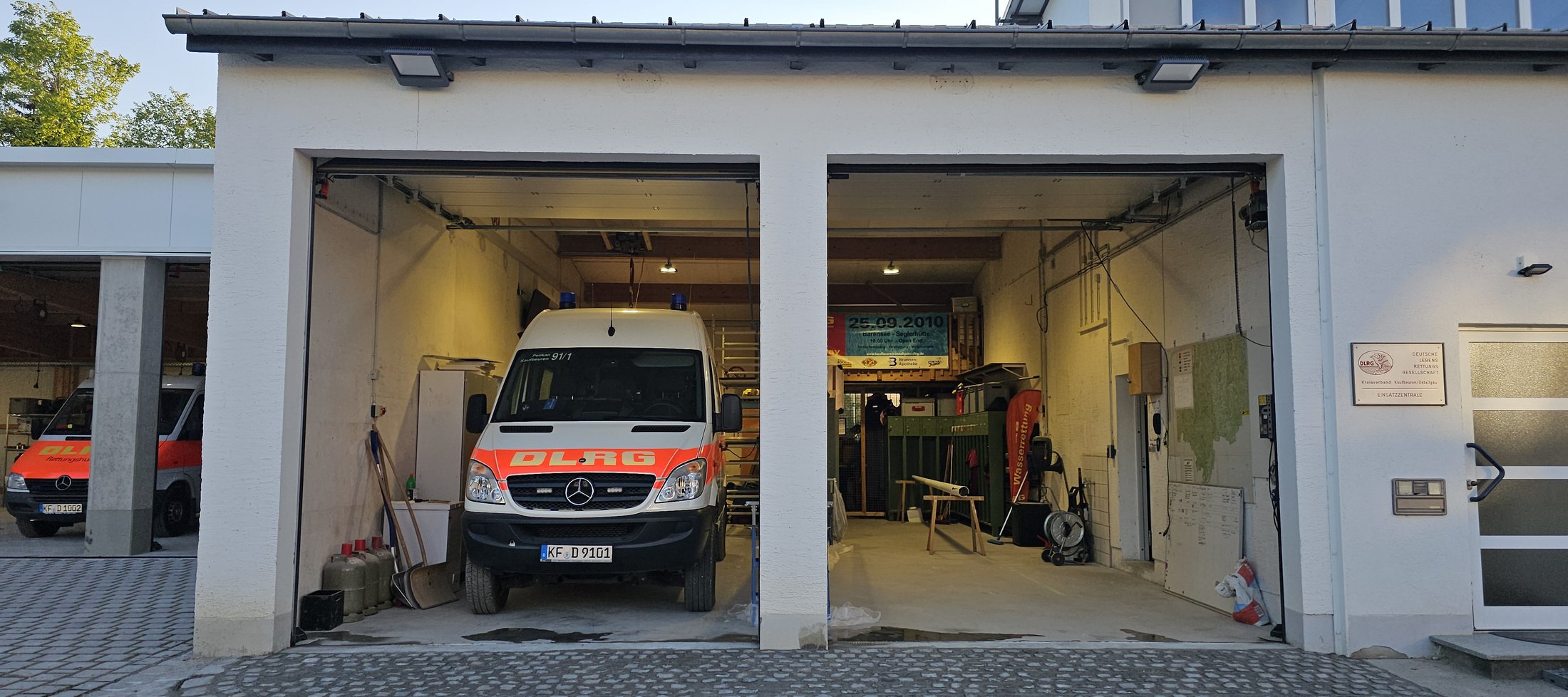 Für unsere Einsatzfahrzeuge und Boote stehen uns 9 Garagen mit 10 Stellplätzen zur Verfügung, ebenso beinhaltet der Garagentrackt einen kleinen Werkstattbereich, so wie unseren Spintraum für den Einsatzfall.